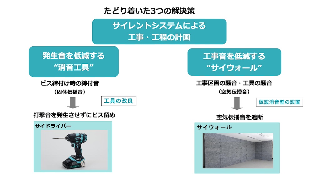 この分析に基づき、8年間にわたり仮説と検証を繰り返した結果、3つの解決策が導き出されました。1つ目は、消音工具を使用して打撃音を軽減すること。2つ目は、消音壁を設置して音の伝播を防ぐ方法、そして3つ目はこれらサイレントシステムを用いた工事・工程の計画です。