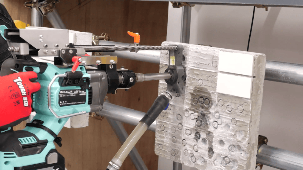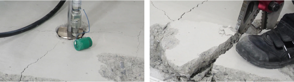 後半は、別の会場に移動し、「サイシンダー工法」を用いたデモンストレーションが実施されました。この工法は厨房の配管コンクリートを破壊する際の振動音を大幅に低減するもので、従来の方法と比較して、打撃による振動がほとんどありません。その結果、静音性に優れ、粉塵の発生も抑えられるため、ビル内テナントの入退去に伴う改修工事にも適用可能です。