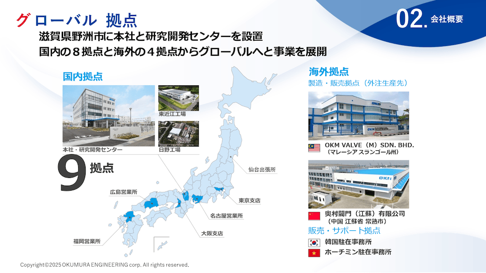 株式会社オーケーエムは、1902年(明治35年)創業のバルブメーカーです。滋賀県を拠点に、国内8拠点のほか、中国・マレーシアに製造拠点、韓国・ベトナムに販売拠点を構え、アジアを中心に海外展開を進めています。